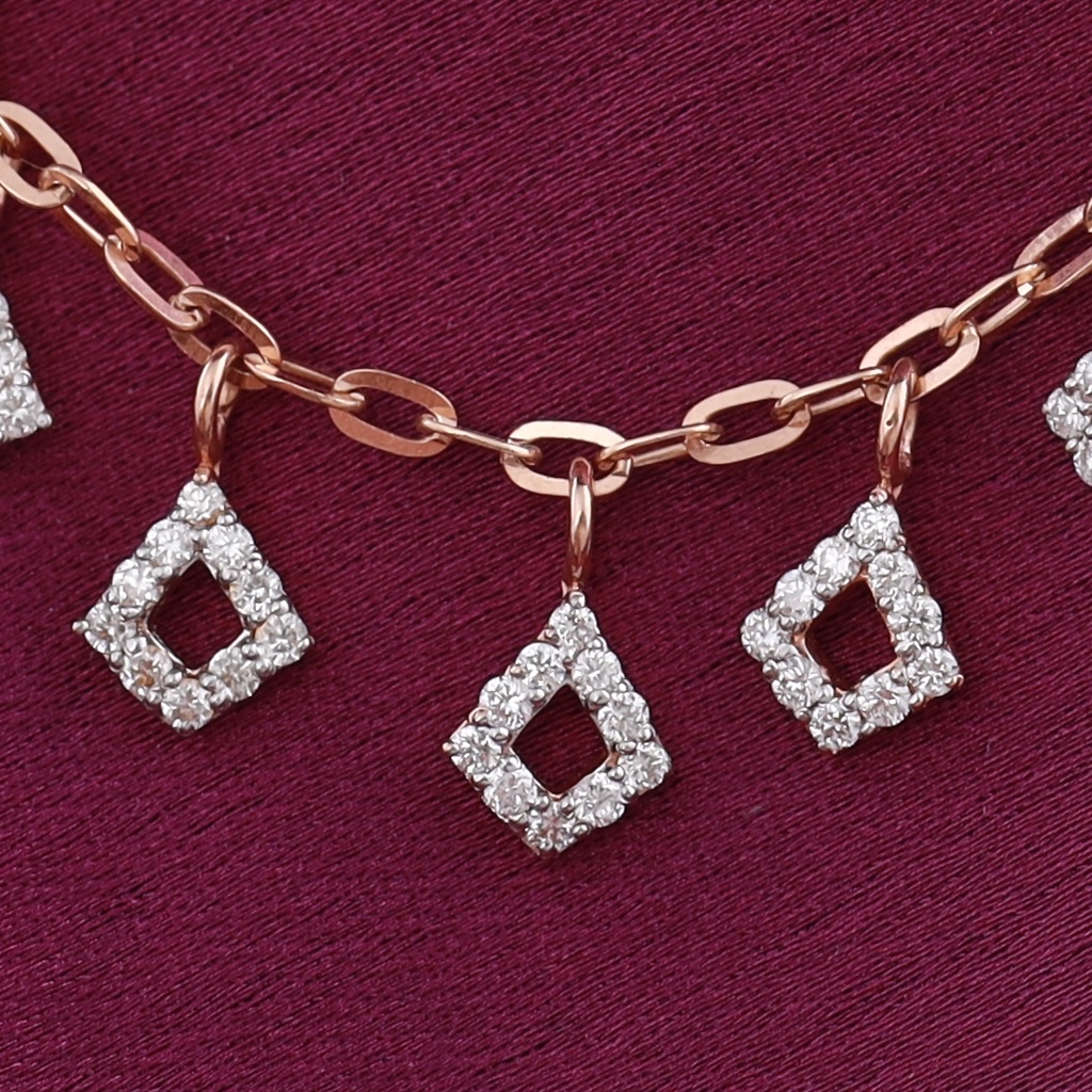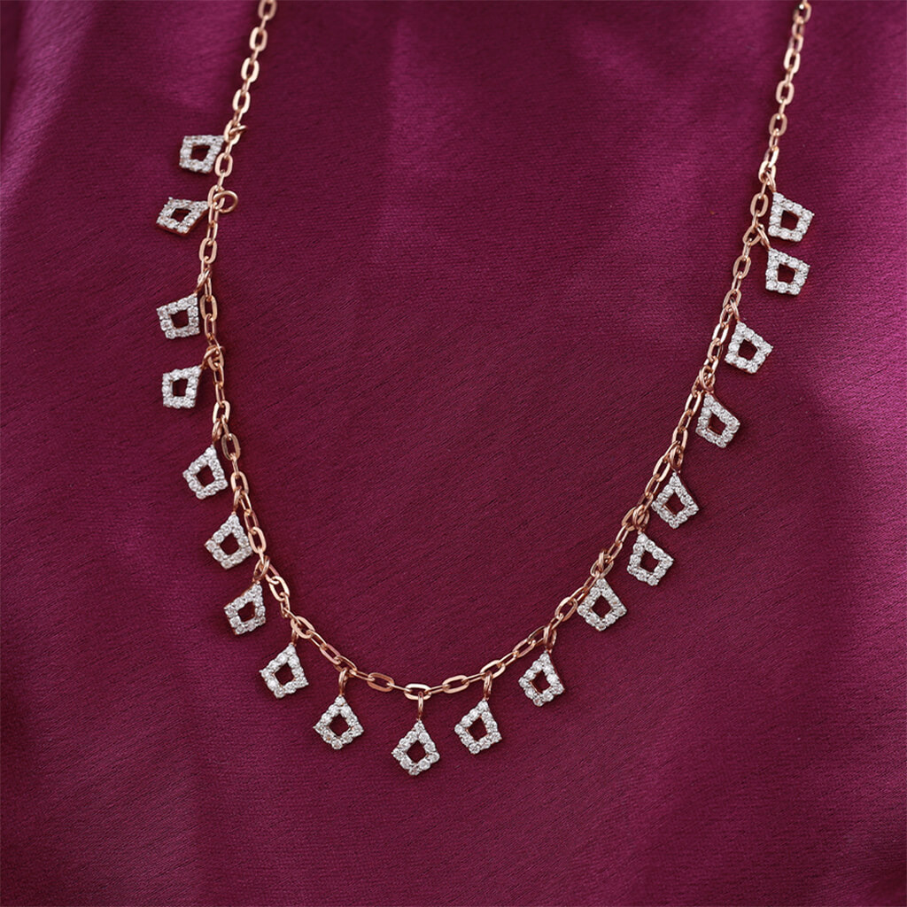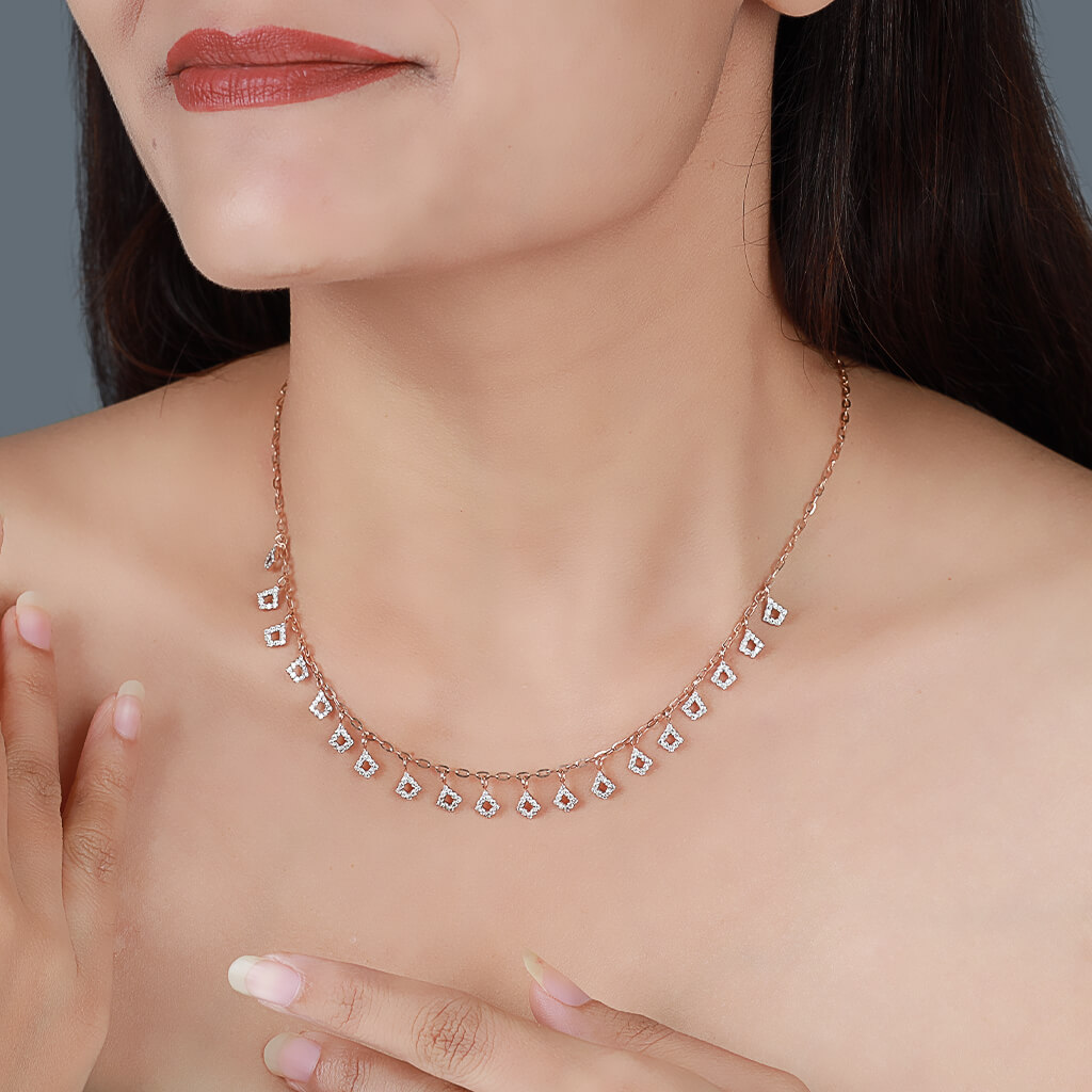 This delicate Cosmic Chimes Diamond Necklace features a series of dainty, diamond-encrusted charms that dangle gracefully from a fine gold chain. Each charm is meticulously crafted in a geometric pattern, resembling twinkling stars or tiny bells, giving the piece a cosmic allure. The minimalist design allows the diamonds to sparkle subtly, making it an elegant accessory that complements both casual and formal attire. Perfect for those who appreciate understated beauty with a touch of celestial inspiration, this necklace adds a hint of sophistication and charm to any ensemble.