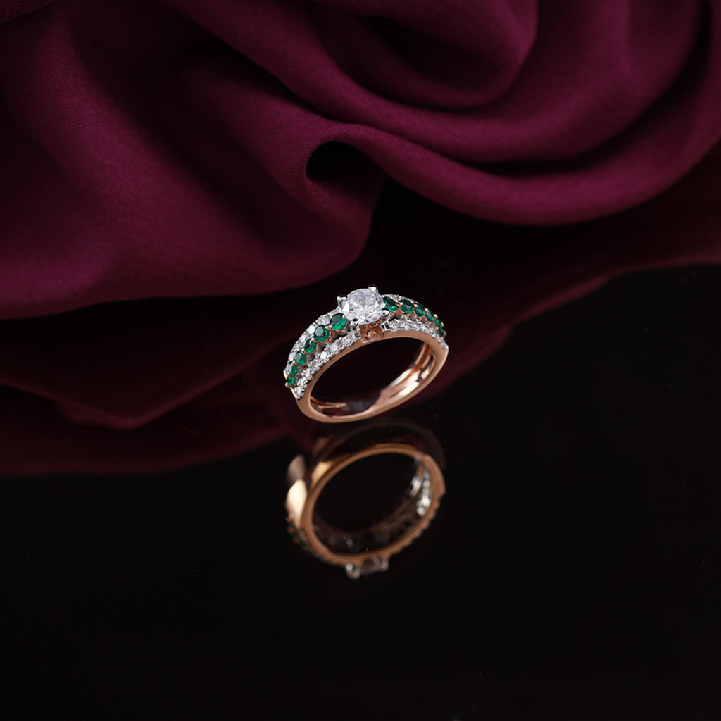 The Emerald Radiance Diamond Ring features a brilliant round-cut diamond at its center, surrounded by vibrant emeralds. Set in polished gold, this ring’s rich green and warm hues create a stunning contrast. A beautifully crafted piece that combines elegance, brilliance, and luxury.