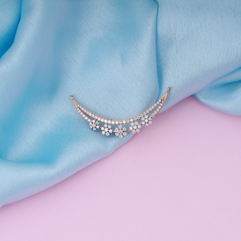 Introducing the Floral Crescent Moon Diamond Mangalsutra: a captivating piece that blends the beauty of nature with celestial elegance. This mangalsutra features a delicate crescent moon design, adorned with a row of sparkling floral diamond clusters. Each flower is intricately crafted, adding a touch of grace and charm to the overall design. The double-strand diamond setting enhances the brilliance, creating a shimmering effect that is both timeless and contemporary. Perfect for the modern bride who desires a blend of tradition and unique style, the Floral Crescent Moon Diamond Mangalsutra is a symbol of love, beauty, and elegance.