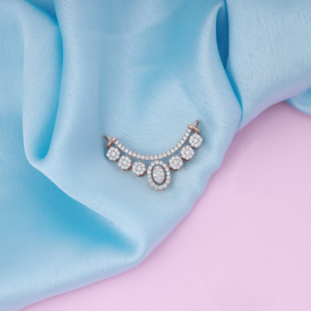 Introducing the Oval Symphony Diamond Mangalsutra: a luxurious piece that harmoniously blends traditional design with modern elegance. This mangalsutra features a series of dazzling round diamond clusters, each intricately set to create a brilliant symphony of light. The central oval motif, adorned with a double halo of diamonds, serves as the focal point, exuding a sense of grandeur and sophistication. The gently curved diamond-studded band adds to the overall elegance, making this mangalsutra a perfect choice for the discerning bride who desires a timeless yet contemporary symbol of love and commitment.