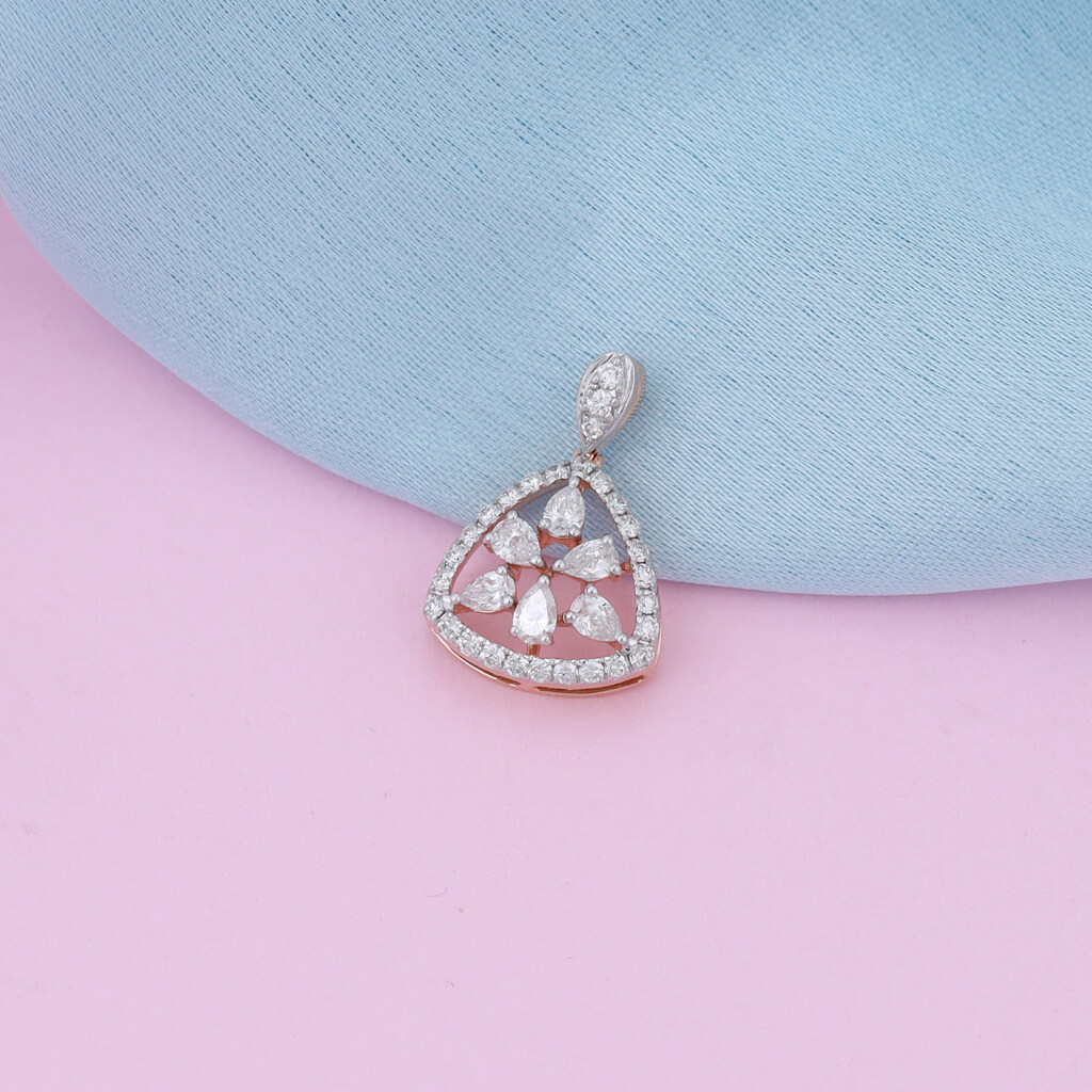 Introducing the Tri-Star Sparkle Diamond Pendant: a unique and captivating piece designed to add a touch of elegance to any outfit. This pendant features a triangular shape, within which star-like diamond motifs are symmetrically arranged. Each star is crafted with marquise-shaped diamonds, creating a stunning sparkle that draws the eye. The outer border of the pendant is encrusted with additional diamonds, enhancing its brilliance and adding depth to the design. The Tri-Star Sparkle Diamond Pendant is perfect for those who appreciate intricate designs and wish to make a statement with their jewelry.